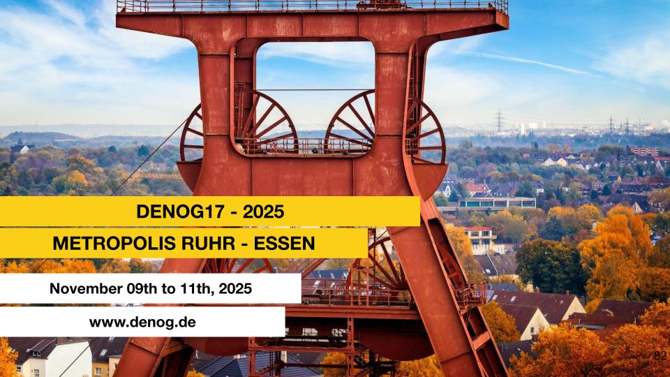 DENOG ist eine Community für Menschen, die am Internet in Deutschland forschen, es betreiben und weiter entwickeln. Im Rahmen dieses technischen Forums treffen sich Personen, die mit, für oder am Internet arbeiten und netzwerkspezifische Themen mit Gleichgesinnten diskutieren, um sie dadurch einfacher lösen zu können.
